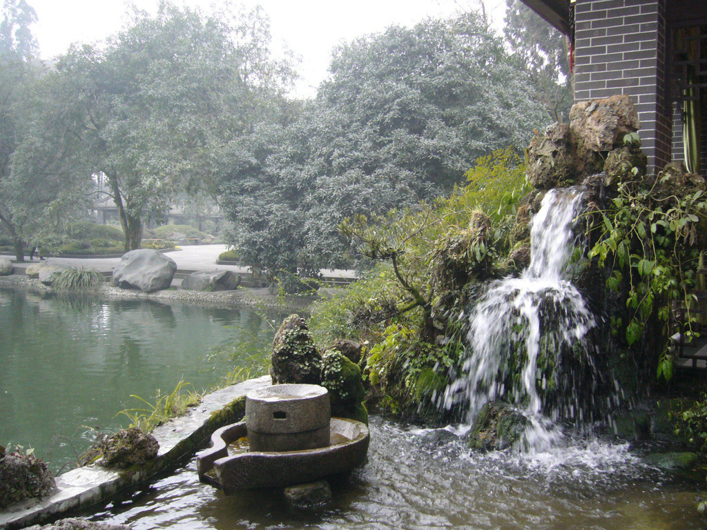 公园内亭榭错落有致,古木桩头,奇花异卉,水池喷泉,布局精巧,别具情趣,园中有紫薇花瓶,紫薇屏风,经二三百年培育而成,独具匠心;这株古银杏桩头,传说为东汉末年张松手植,至今仍亭亭玉立,枝繁叶茂,像一支仙鹤,托这里山水的灵气,听说还结出了果实。紫薇花瓶、紫薇屏风和银杏桩,人称“园中三宝”。